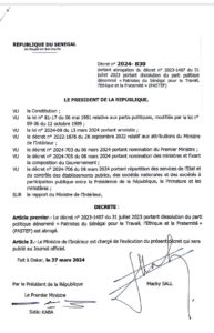 Le décret portant dissolution du Parti Patriotes du Sénégal pour le travail, l’éthique et la fraternité ( PASTEF) a été abrogée. Ceci, par décision en date du 27 mars 2024 signé du Président sorti Macky Sall et l’ancien premier ministre Sidiki KABA. Le parti dissout pour méconnaissance de ses obligations en vertu de l’article 4 de constitution, de l’article 4 de la loi n°81-17 du 06 mai 81 relative aux partis politiques modifiée par la loi 89-36 du 12 octobre 1989 retrouve toute sa légitimité après le loi 2024-09 du 13 mars 2024 qui amnistie les faits incriminés.