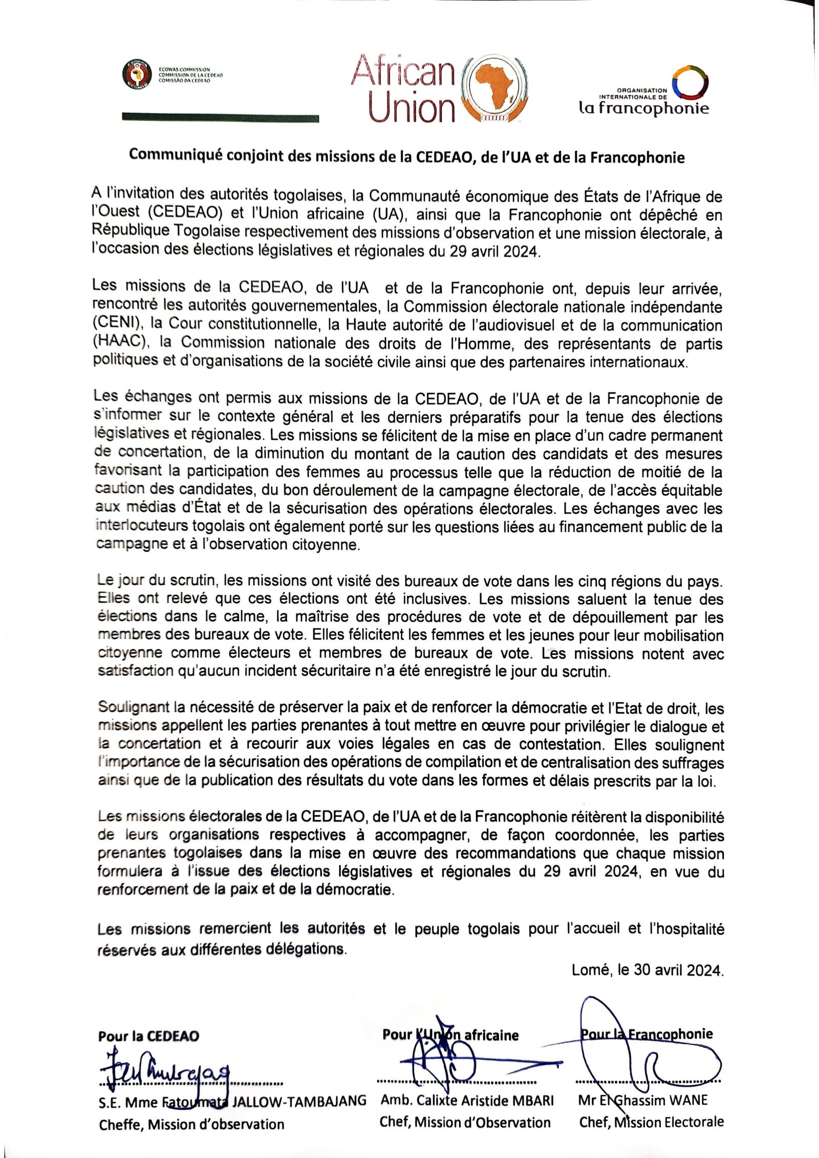 Les missions de la CEDEAO, de l’UA et de la Francophonie ont publié un communiqué conjoint saluant le déroulement pacifique et inclusif des élections législatives et régionales qui se sont tenues au Togo le 29 avril 2024. Les observateurs ont noté une mobilisation citoyenne importante, en particulier de la part des femmes et des jeunes, tant en tant qu’électeurs que membres de bureaux de vote.