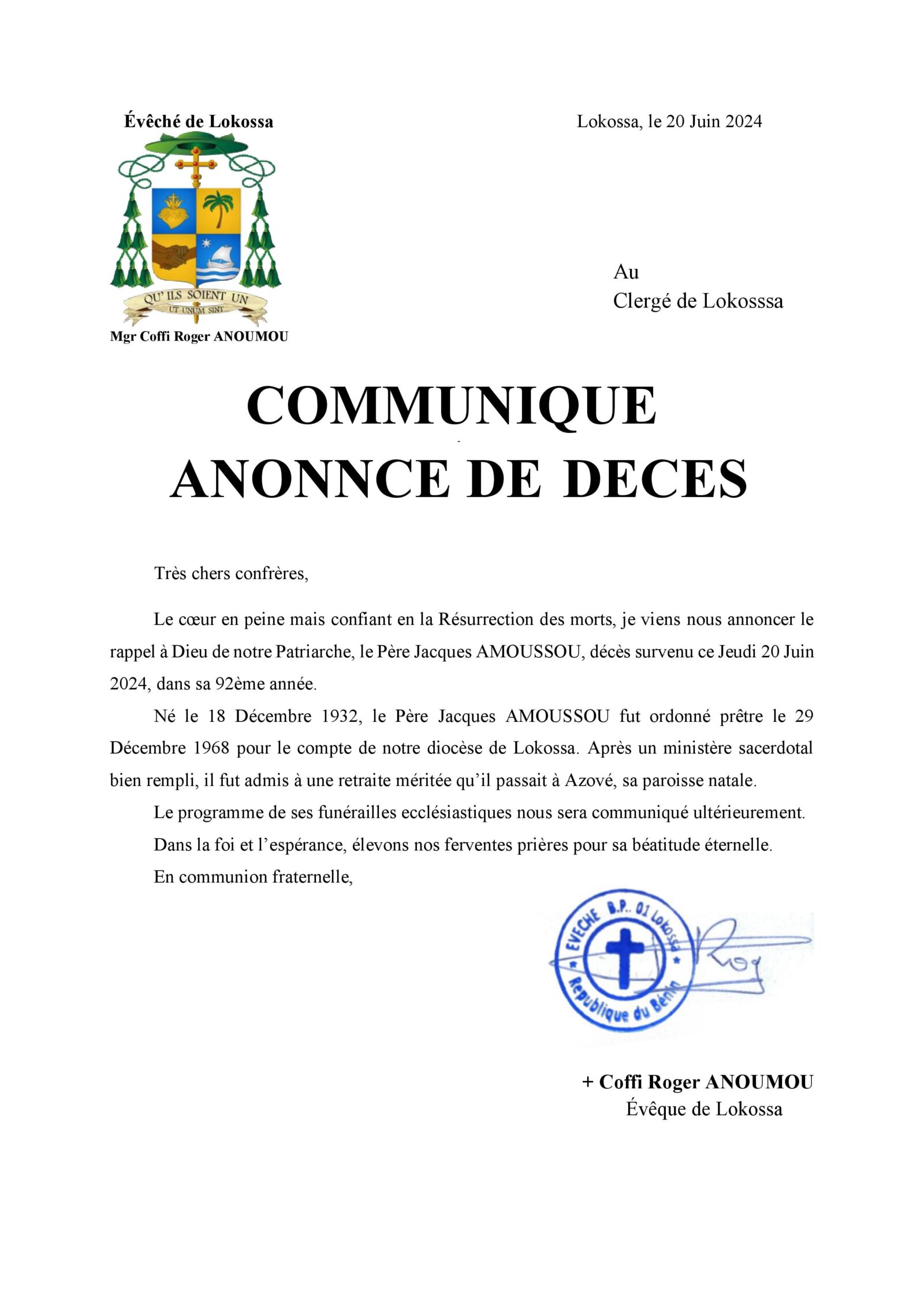 La communauté du clergé de Lokossa est en deuil suite au décès du Père Jacques AMOUSSOU, survenu le Jeudi 20 Juin 2024, à l’âge de 92 ans. Le Père AMOUSSOU était une figure respectée et aimée au sein du diocèse de Lokossa, où il a exercé son ministère sacerdotal pendant de nombreuses années.