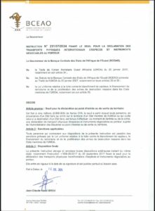 La Banque Centrale des Etats de l’Afrique de l’Ouest (BCEAO) vient de publier une instruction fixant un seuil pour la déclaration des transports physiques internationaux d’espèces et instruments négociables au porteur. Selon cette instruction, toute personne en provenance d’un Etat tiers et entrant ou quittant un Etat membre de l’UMOA avec un montant égal ou supérieur à cinq millions de francs CFA devra effectuer une déclaration au point d’entrée ou de sortie du territoire.