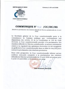 La Cour constitutionnelle du Bénin a annoncé qu’elle rendra publics les résultats définitifs de l’élection présidentielle du 12 avril 2026 le jeudi 23 avril.