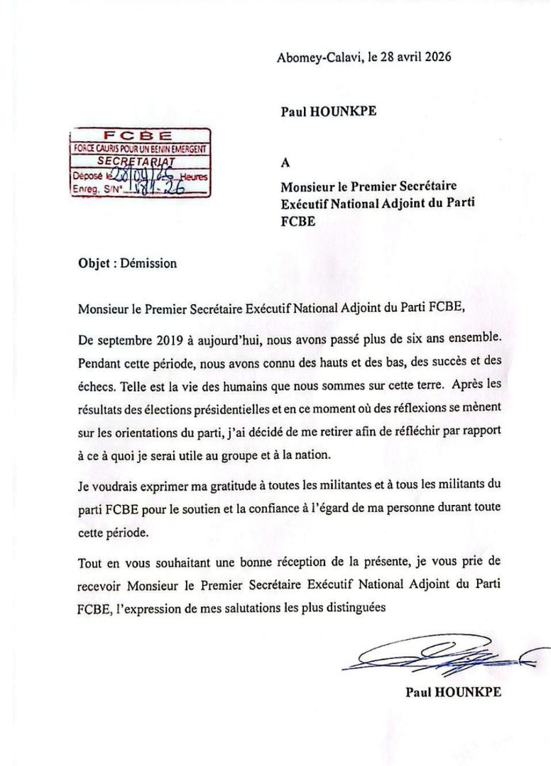 Dans une lettre datée du 28 avril 2026 à Abomey-Calavi, Paul Hounkpè a officialisé sa démission de ses fonctions au sein du parti FCBE. Après plusieurs années de collaboration marquées par des succès et des défis, l’acteur politique dit vouloir prendre du recul pour réfléchir à son rôle futur au service du parti et de la nation.