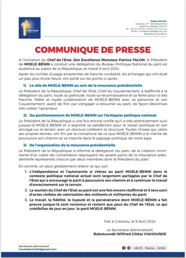 Le parti politique Moele Bénin a récemment renforcé sa position au sein de la mouvance présidentielle lors d’une rencontre avec le Chef de...