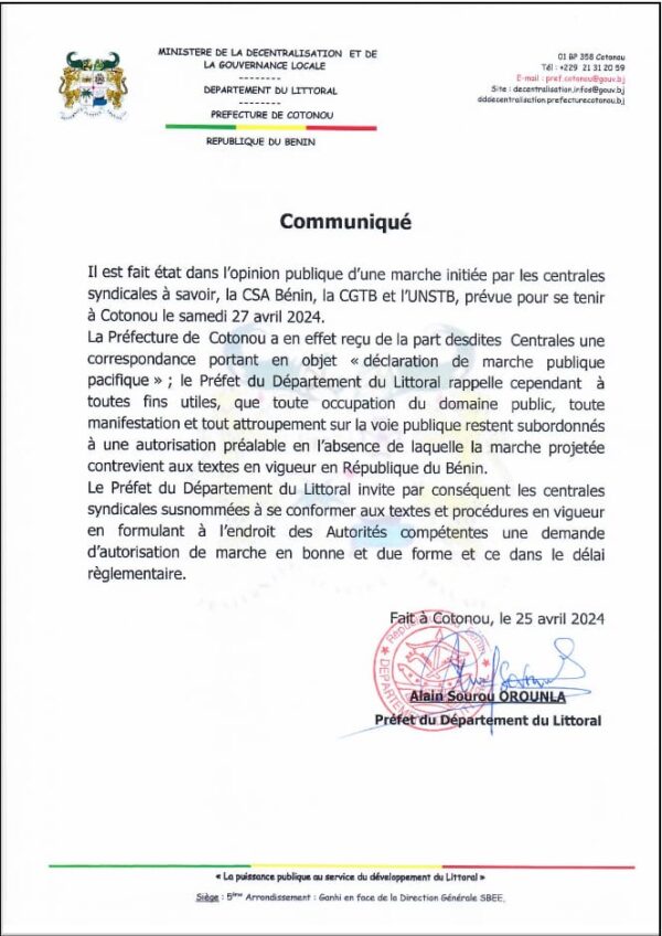 ParAlafi Infos27 avril 2024La marche syndicale projetée par certaines organisations syndicales, la CSA Bénin, la CGTB et l’UNSTB ne saurait être effective sans une autorisation préalable....