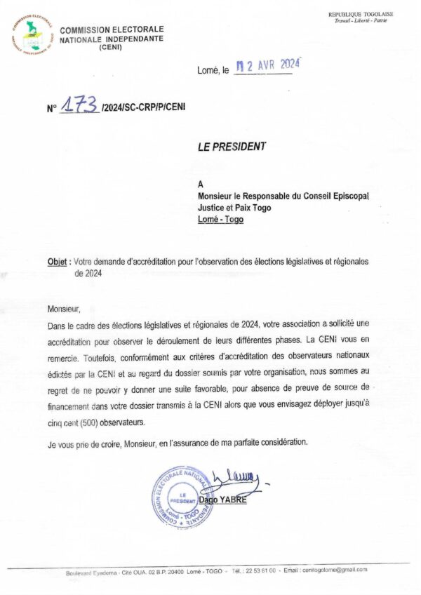 ParAlafi Infos1 mai 2024La demande d’accréditation du Conseil épiscopal paix et justice au Togo, dans le cadre du déploiement de ses observateurs a essuyé un refus....