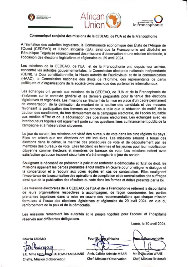 ParAlafi Infos7 mai 2024Les missions de la CEDEAO, de l’UA et de la Francophonie saluent le processus Les missions de la CEDEAO, de l’UA et de...